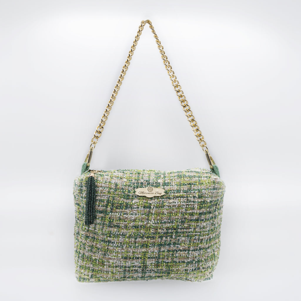 Borsa in tessuto tweed. Rivestimento interno monocolore. Tracolla corta e removibile bicolore.