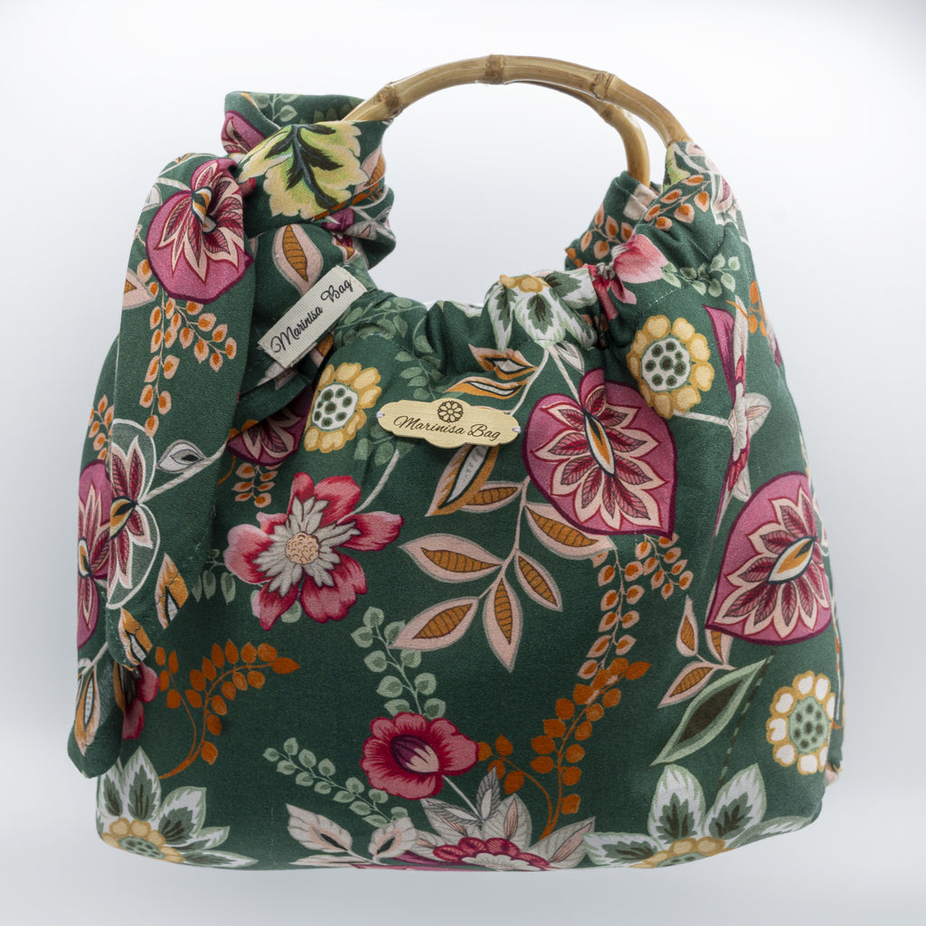 Borsa in tessuto floreale. Rivestimento interno monocolore. Manico in bambù.