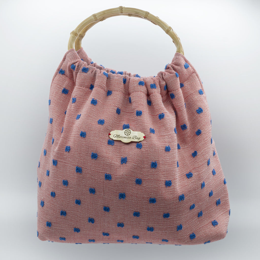 Borsa in tessuto decorato a quadretti in rilievo. Rivestimento interno monocolore. Manico in bambù.