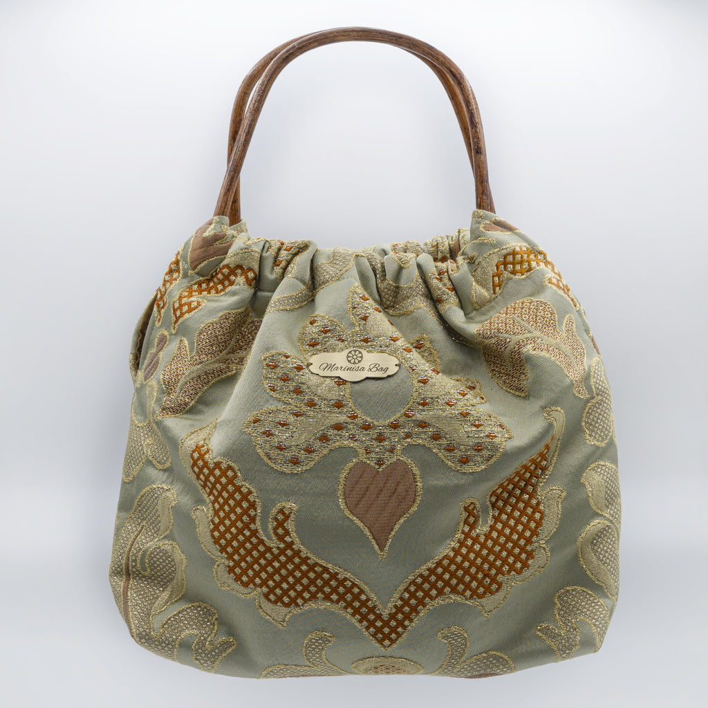 Borsa in tessuto con decorazioni in rilievo. Rivestimento interno monocolore. Manico in bambù.
