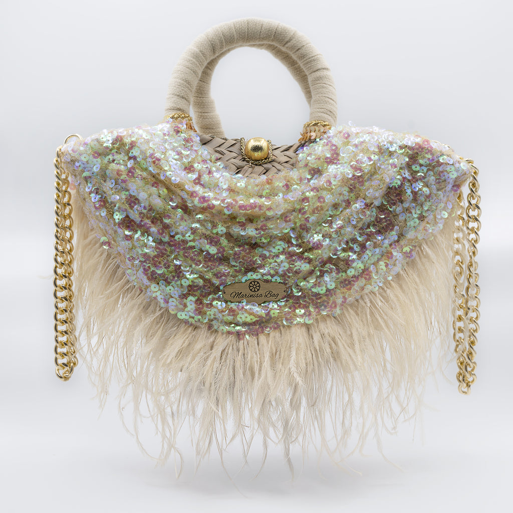 Coffa in palma nana intrecciata. Rivestita esternamente da un tessuto a drappeggio di strass avorio, tutto adornato da piume e passamanerie del medesimo colore. Manico completamente rivestito. Chiusura con bottone e rivestimento interno a sacca in cotone avorio.