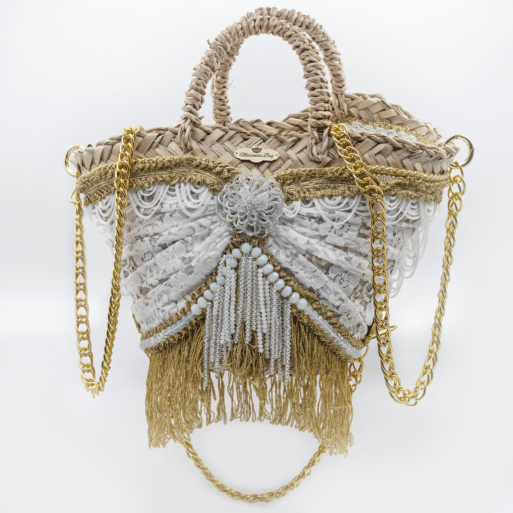 Coffa in palma nana intrecciata. Rivestimento esterno con un drappeggio di pizzo bianco, passamanerie del medesimo colore e frange e lustrini oro che ne accentuano l'eleganza. Nella parte frontale un fiore in perline e una frangia in cristalli creano un effetto gioiello. Alle estremità due leoni reggono una catena oro, che dona particolarità e armonia nella forma. Rivestimento interno in velluto bianco e passamanerie oro. Chiusura con nodo.