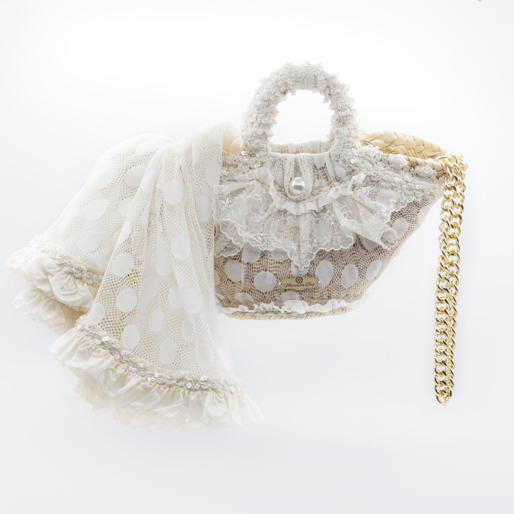 Coffa in paglia nana intrecciata. Completamente rivestita da un tessuto trasparente a pois avorio e impreziosita da passamanerie e strass del medesimo colore. Nella parte frontale un volant ricamato dona eleganza, armonia e romanticismo. Manico completamente rivestito, chiusura a sacca e con bottone.Tracolla oro removibile.