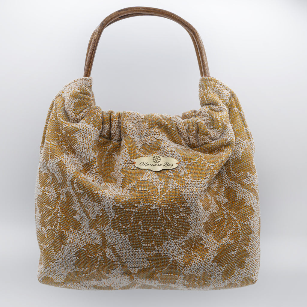 Borsa in tessuto a fantasia floreale. Rivestimento interno monocolore. Manici in bambù.