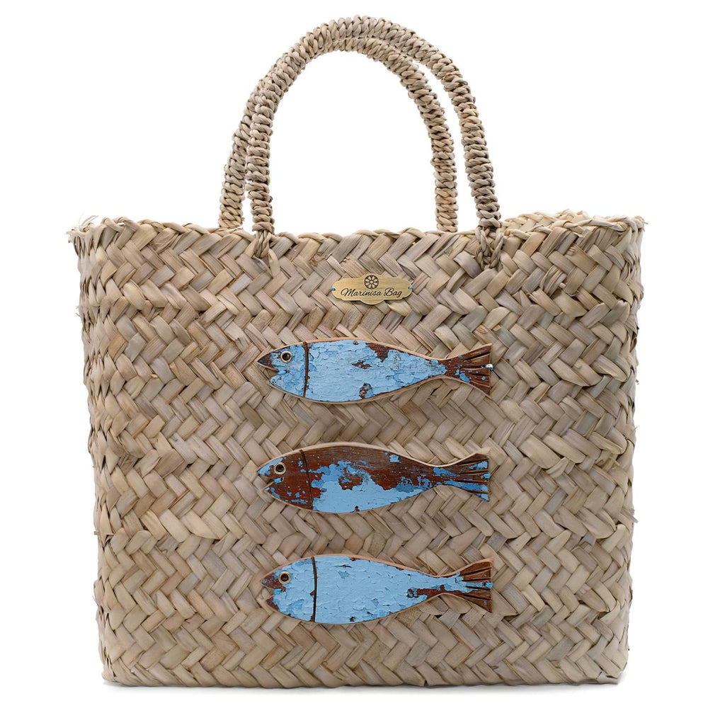 Braided dwarf palm crow's nest, frontally decorated with three light blue wooden fish. The inside is covered with a white fabric with logo. Zip closure.