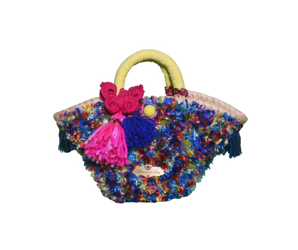 The front is adorned with unkempt cotton threads. On one side it features an embroidered fuchsia butterfly and two tassels in matching colours. The back is embellished with a blue fringe and fuchsia rhinestone trimmings, like the handles. Internal lining, pocket included. Button closure.