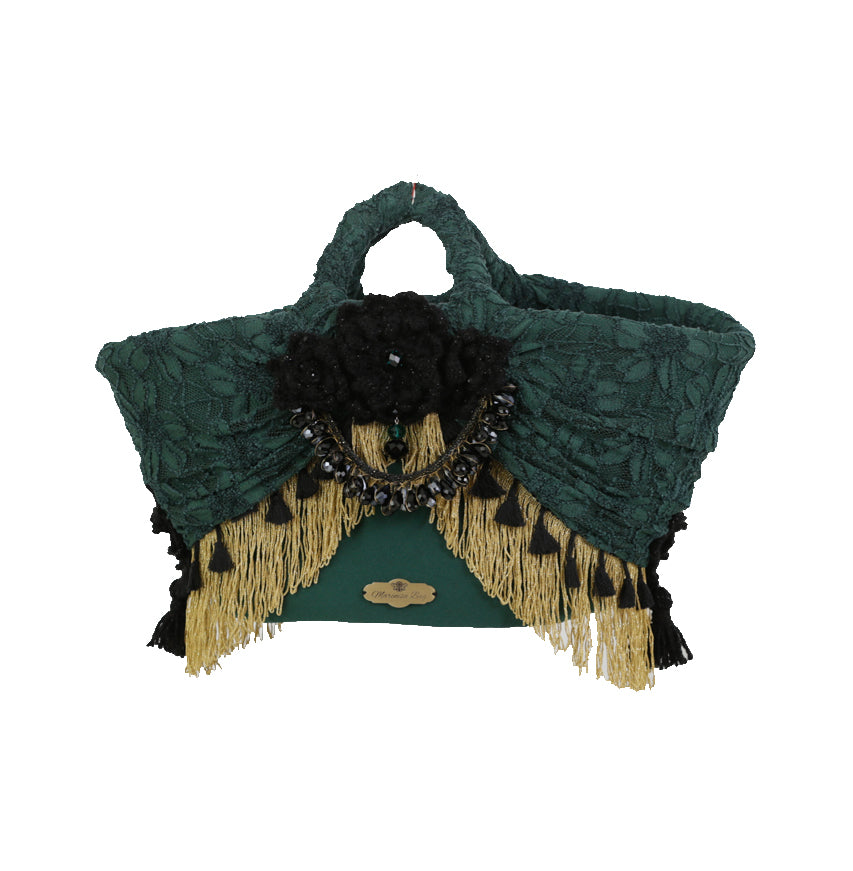 Sicilian crow's nest in woven dwarf palm, entirely covered in green fabric and lace sewn to drape both on the front and on the back. The front part is enriched with three flowers in black and gold wool, handmade, the central one is embellished with green and black crystals. In the underlying part a cluster of black crystals gives the crow's nest elegance and majesty. In the lower part a golden fringe and black trimmings contribute to making it regal, flashy, but always elegant and sophisticated. On the two sides of the crow's nest, two black wool flowers with tassels give harmony in the shape and division of the colours. Closure with pouch, including pocket embellished like the crow's nest. Matching clutch bag with the same fabrics and trimmings.