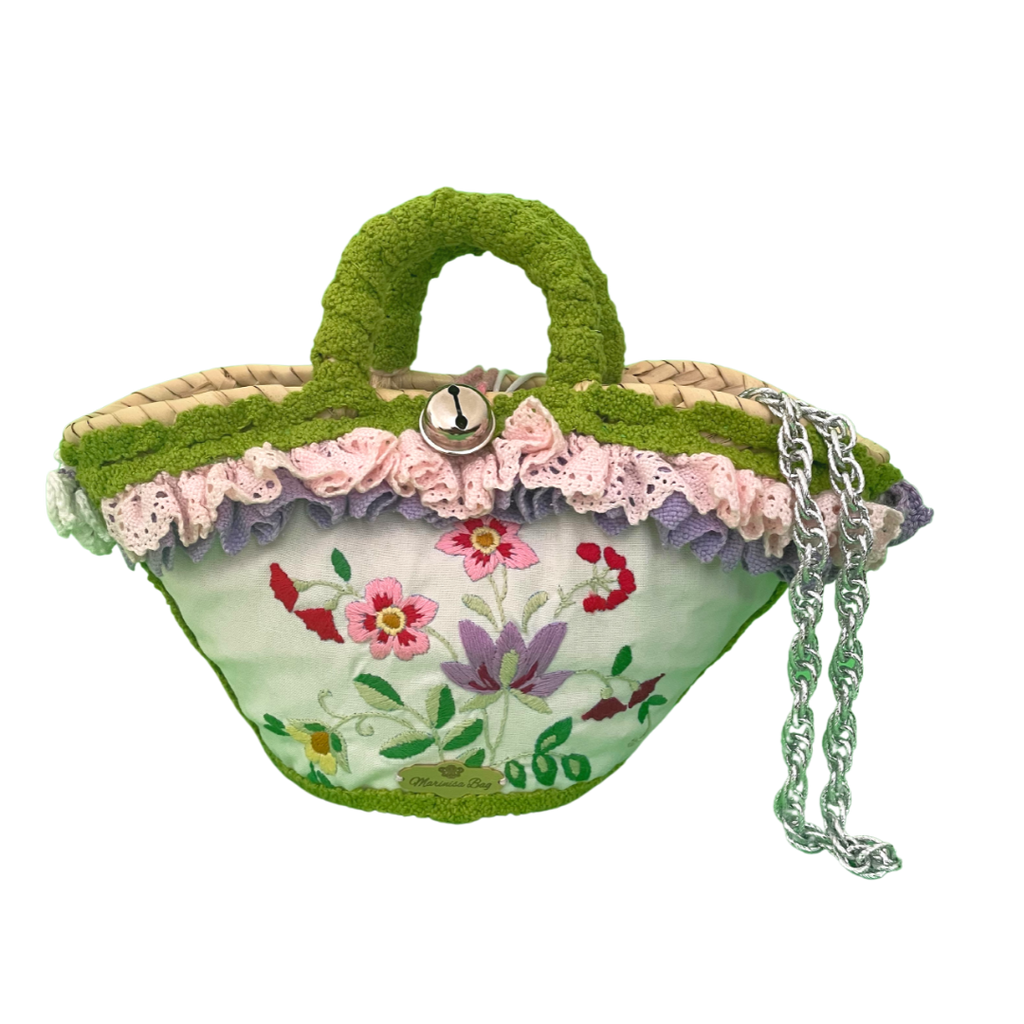 The front part is completely enriched by a fabric with floral embroidery, surrounded by curled cotton trimmings. The two ends are embellished with two crochet-embroidered butterflies. Internal lining with matching pocket. Button closure and shoulder strap with silver metal chain.