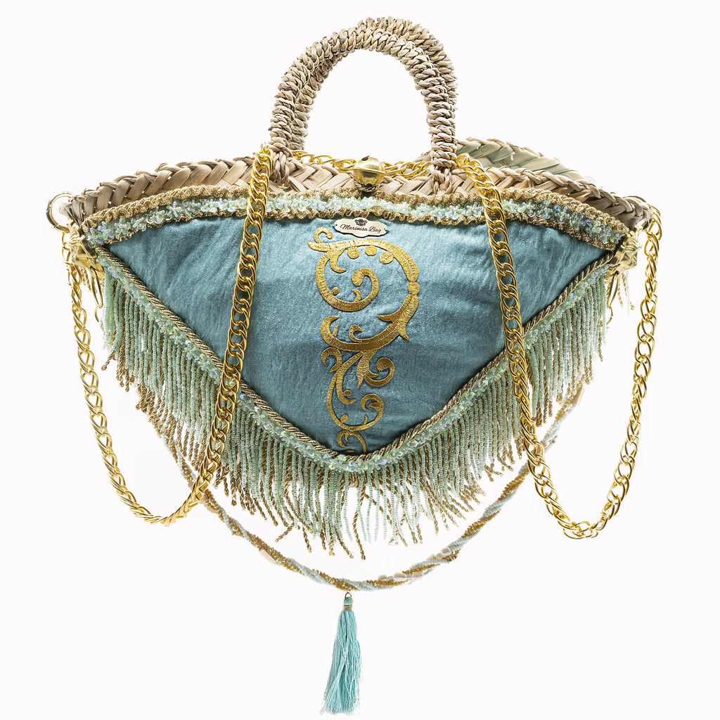 Braided dwarf palm crow's nest. The front part is embellished with a bright aqua green fabric, where a gold embroidery is embossed. The central decoration is enriched by a set of trimmings and fringes, one of which is made of beads which increase its elegance. On the sides, two Sicilian brass lions hook a cascade of beads, where a tassel is placed in the center. Its interior is lined with a bag of the same fabric and includes a pocket. Removable gold chain shoulder strap. Sicilian bell closure.