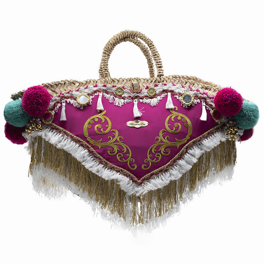 Braided dwarf palm crow's nest. The front part is embellished with a bright fuchsia fabric, where gold embroidery is embossed. The central decoration is enriched with five gold, fuchsia and white trimmings and fringes, which together create a wonderful harmony. On the sides three pom poms and a cascade of beads in the same colors enhance its Sicilian character. The upper part is adorned with mirrors and brass studs that recall Sicilian folklore. In the back part the same trimmings create a harmonious movement. The interior is lined with the same fabric and includes a matching pocket. Jewel button closure.