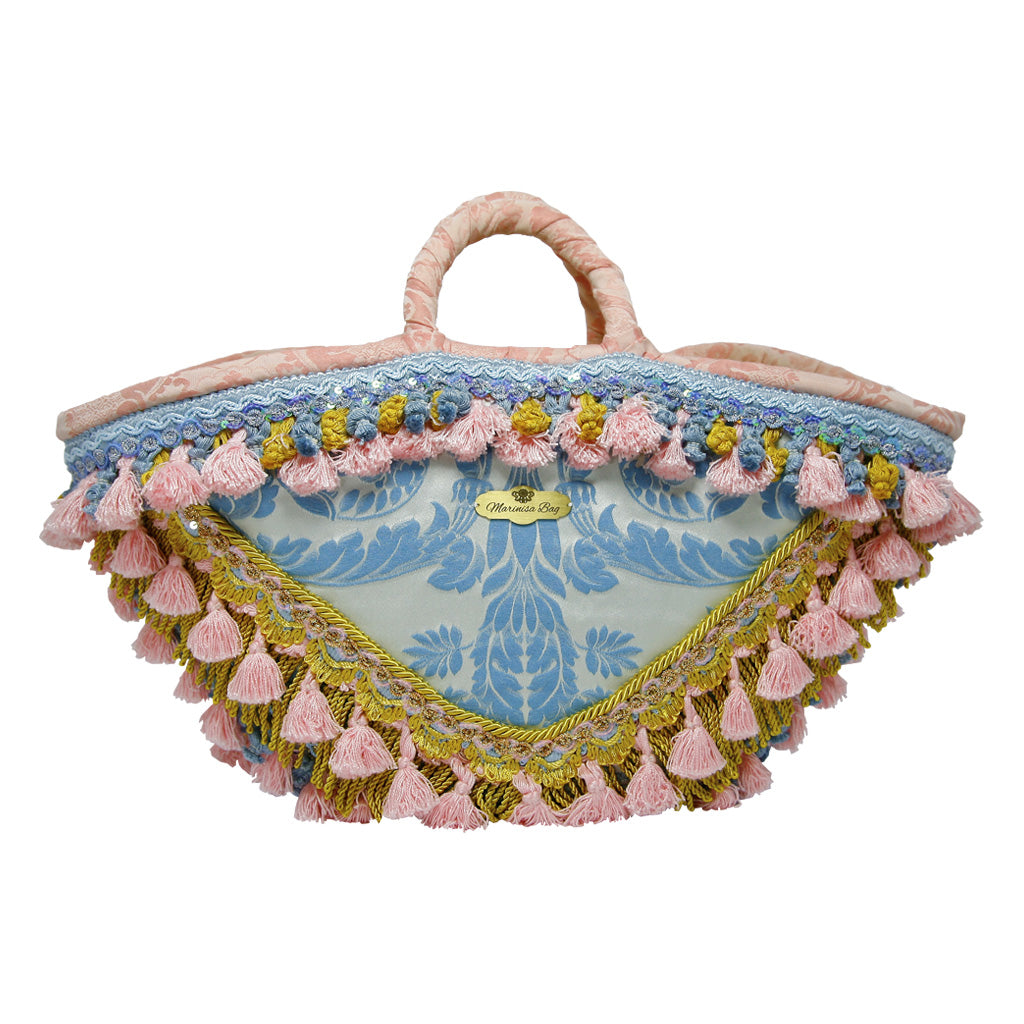 Fully woven dwarf palm crow's nest, covered in damask fabric and decorated with pink, gold and light blue trimmings. The front part is enriched by a triangular decoration covered with seven trimmings that make it sumptuous and majestic. The handle completely in pink damask fabric. The fully lined interior is closed by a zip. Internal pocket included and matching clutch bag.