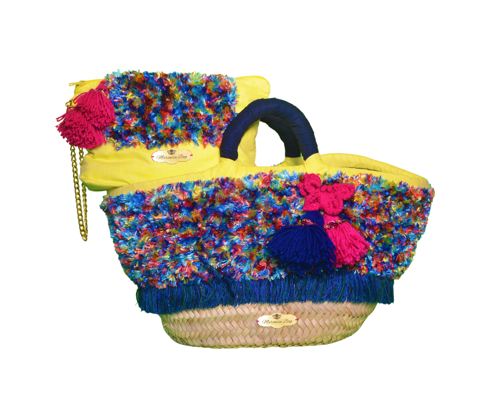 The front and back are completely adorned with unkempt cotton threads and a blue fringe, which highlights its particularity. One side of the handle is enriched with an embroidered fuchsia butterfly, two matching tassels. Internal lining, pocket and matching clutch bag , zip closure.